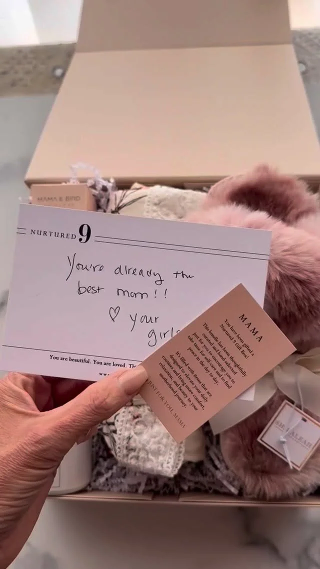 This new mom care package is beautifully packaged in our luxe signature Nurtured 9 gift box, topped with ribbon and your gift note, handwritten on our Nurtured 9 card (no need for additional gift wrapping!).
