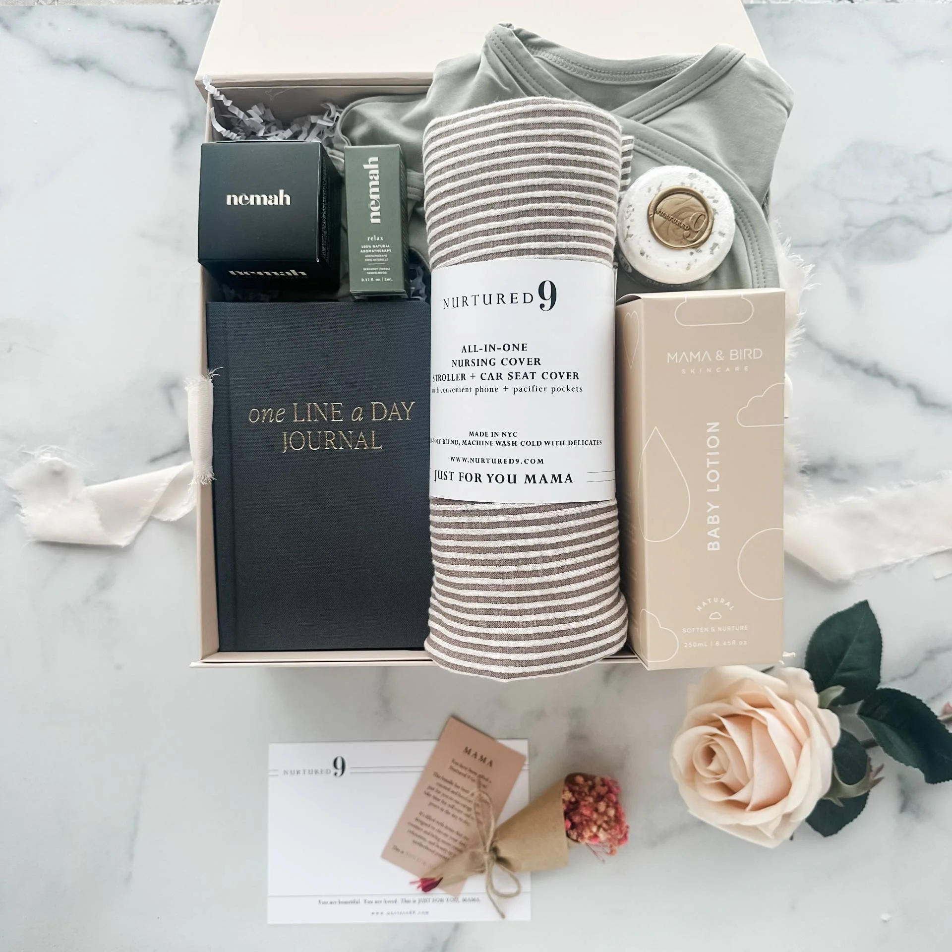 “If we haven’t met yet — hi, I’m Hillary! I’m a labor & delivery nurse, feeding specialist, and mom of four, which basically means I’ve lived every version of new-mom chaos. This box is filled with things I wish someone had handed me during those first hazy weeks — little comforts, real essentials, and a few treats that remind you you’re still you. My hope is that when you open this box, you feel supported, cared for, and a little less alone in this wild season. You can find me at www.babysettler.com and @babysettler.”