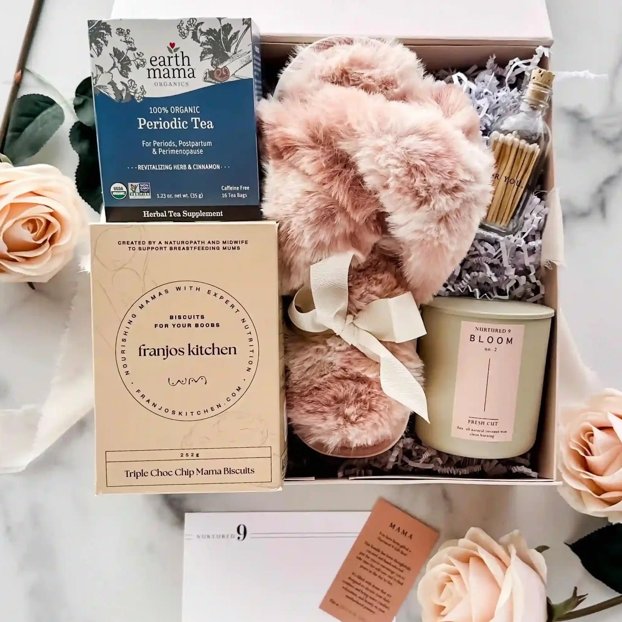 All curated signatured gift boxes are assembled in our luxury nude pink Nurtured 9 gift box topped with ribbon, which can be gifted directly to mom (no need for additional gift wrapping!).