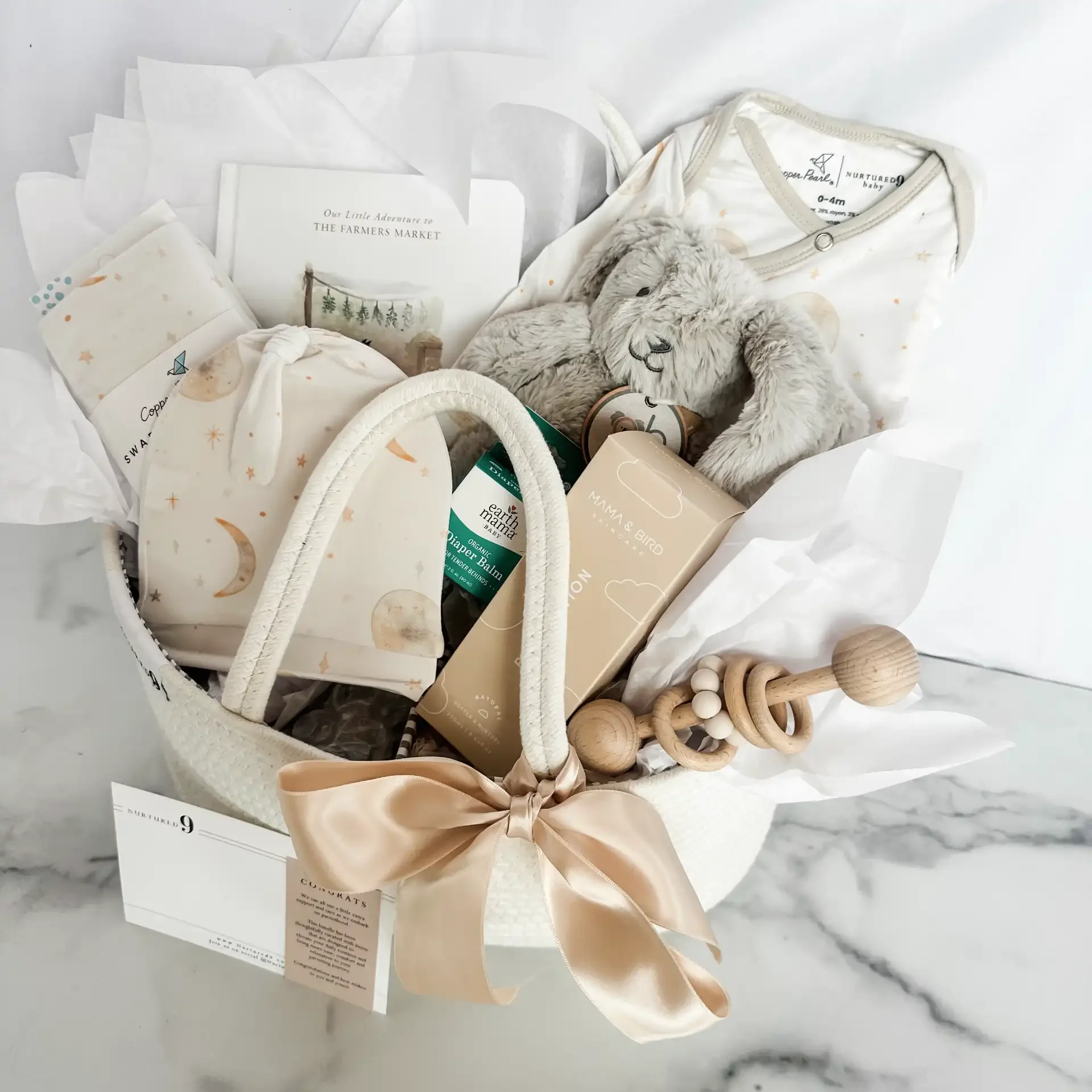 To curate this baby shower gift basket, we started with a couple of new baby must-haves: a jar of Earth Mama organic diaper balm to soothe the little one’s delicate skin, and a gentle nurturing baby lotion from Mama & Bird. Next, we included the Copper Pearl X Nurtured 9 newborn knotted gown (with built-in mittens), hat, and swaddle, all in an adorable moon and stars print - because babies need lots of soft, easy-to-change clothing during those first few weeks! We topped off this gift with three more baby items that provide entertainment and snuggles: the “Our Little Adventure to the Farmers Market” board book, a wooden and silicone rattle, and a fluffy stuffed bunny (with the option of personalizing his nametag). All of these new baby essentials have been carefully assembled inside our white rope diaper caddy, which not only makes a beautiful gift presentation, but also offers storage convenience for a busy Mama. Welcome home sweet baby!