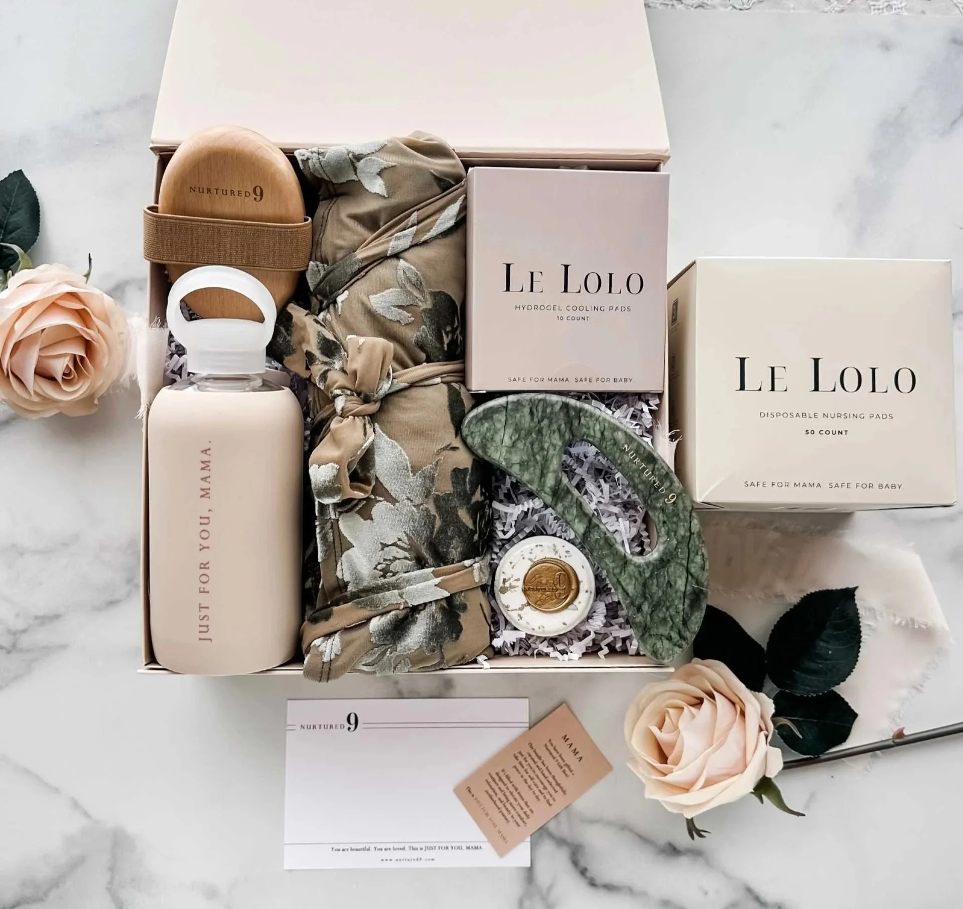 Since every mom is unique, our baby shower gift item combinations at Nurtured 9 are truly endless! We’ve stocked our shop with all of the baby shower gift basket essentials so that you can customize your own personalized present. Build the perfect baby shower gift basket in our Curate-Your-Own shop; Simply add items for Mom and baby to your cart and we will bundle it all up into a beautiful, customized baby shower gift for Mom. Here’s a glimpse at some of our bestselling baby shower gift basket items for moms: