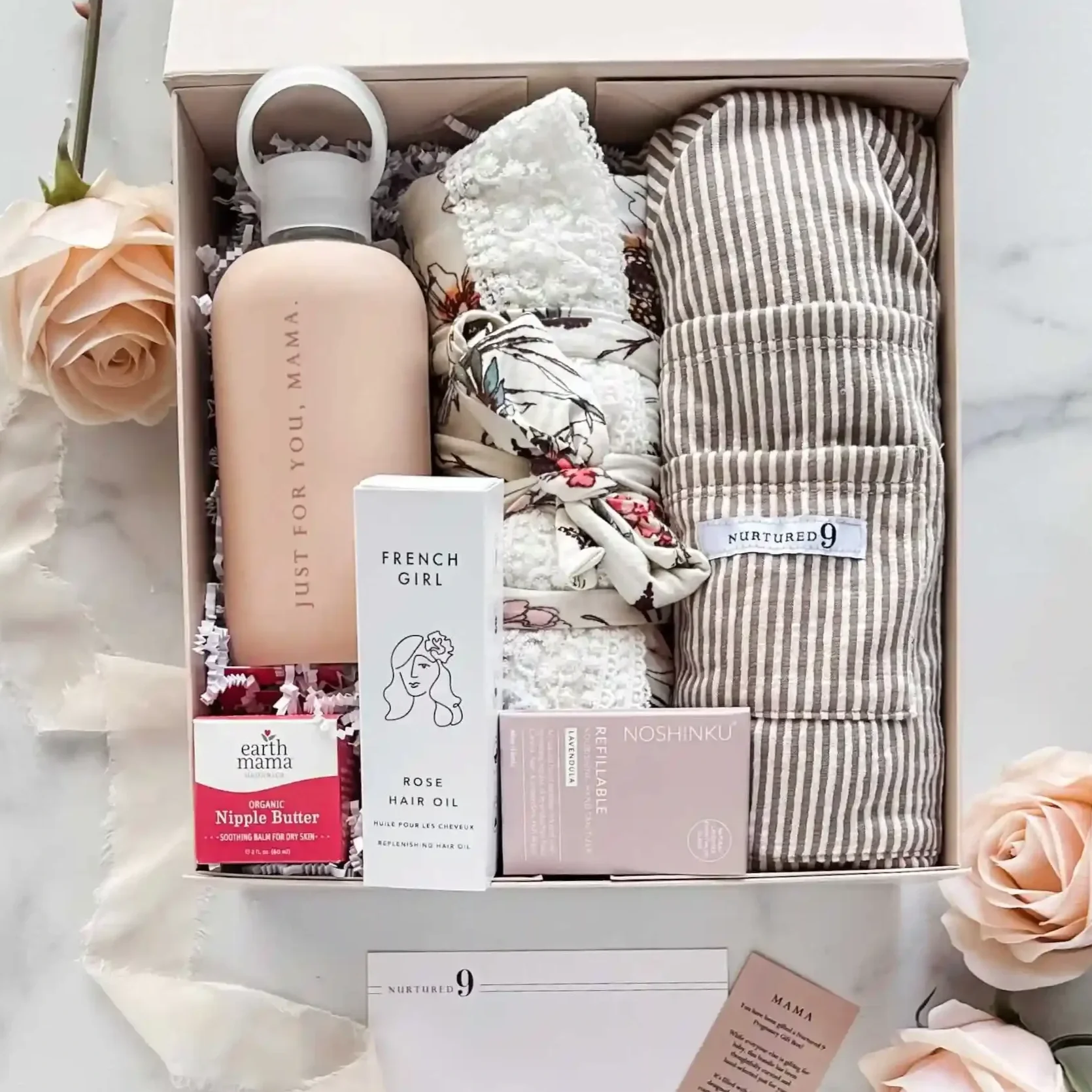 We at Nurtured 9 love a baby shower gift for mom! More specifically, we focus on gifting luxurious products designed to comfort, soothe, and support Mama throughout pregnancy and postpartum to help her feel her absolute best. So while everyone else is gifting items for the new baby, we say, bring (or send) a gift for a baby shower that’s just for mom! Read on (or skip to the product round-up below) to find the best baby shower gift for the mom! All of Nurtured 9’s baby shower gifts are built by hand by us at our gifting studio in Tucson, AZ, beautifully wrapped (including tissue paper, ribbon, and a handwritten notecard), and shipped out within one business day so you can enjoy fast shipping!