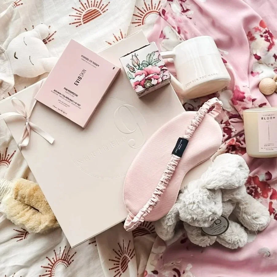 This new mom care package is beautifully packaged in our luxe signature Nurtured 9 gift box, topped with ribbon and your gift note, handwritten on our Nurtured 9 card (no need for additional gift wrapping!).